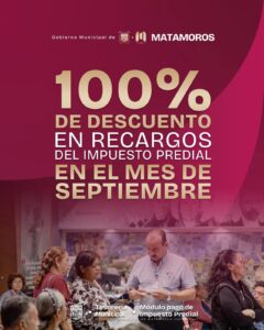 El gobierno municipal de Matamoros, que preside el alcalde Beto Granados, invita a la ciudadanía a aprovechar durante todo el mes de septiembre los descuentos del cien por ciento en recargos del impuesto predial.