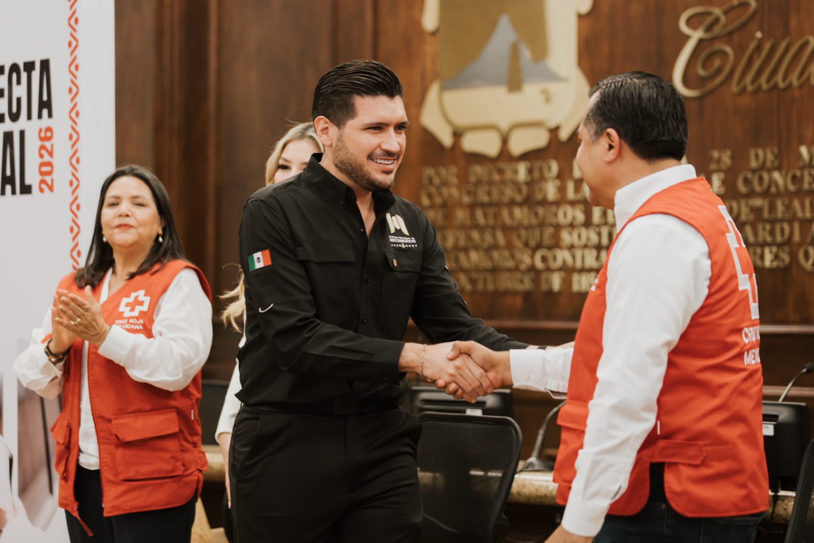 Durante el evento, el presidente municipal, Beto Granados, y la presidenta del Sistema DIF Matamoros, Ana Ariceaga de Granados, recibieron un pin como miembros honorarios de la Cruz Roja Mexicana.