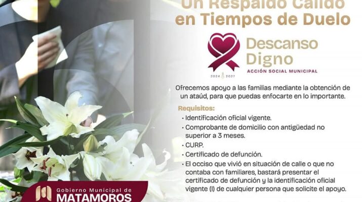 El Gobierno Municipal de Matamoros, encabezado por el alcalde Beto Granados, reafirma su compromiso con las familias que atraviesan momentos de profunda tristeza a través del programa “Descanso Digno”. Esta iniciativa busca brindar apoyo humano y solidario a quienes enfrentan la pérdida de un ser querido, asegurando que ningún matamorense se sienta solo durante su duelo.