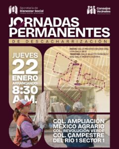 Las acciones darán inicio a las 8:30 de la mañana y se desarrollarán en las colonias Ampliación México Agrario, Revolución Verde y Campestre del Río, Sector 1, donde se realizará el retiro de objetos en desuso que puedan acumular agua y convertirse en criaderos de mosquitos. El recorrido iniciará en la calle Praxedis Balboa esquina con calle Seis y concluirá en la calle Agapito González esquina con calle Vicente Guerra.